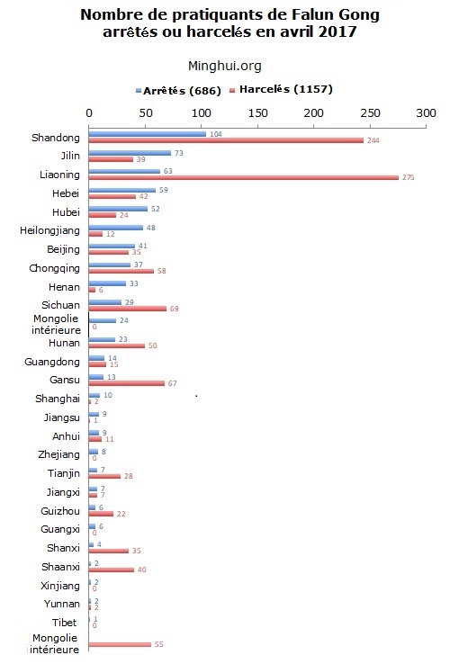 (Minghui.org) Selon les informations compilées par Minghui.org, 1843 pratiquants de Falun Gong ont été soit arrêtés, soit harcelés en avril 2017 dans le cadre de la persécution de cette discipline spirituelle par le Parti communiste chinois.