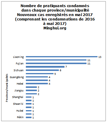 La durée des peines enregistrées en mai 2017 varie de 5 mois à 12 ans, avec une durée moyenne de 3,44 ans. En particulier, neuf pratiquants de la province du Fujian ont été condamnés pour avoir produit des documents d'informations sur la persécution du Falun Gong. Trois d'entre eux ont reçu des peines de 10 ans ou plus.