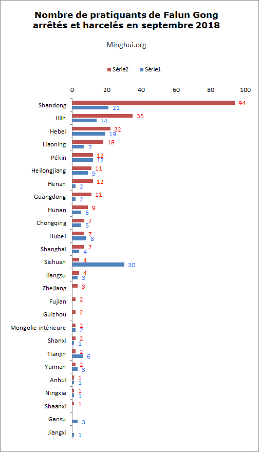 Les arrestations et le harcèlement ont eu lieu dans 26 provinces et municipalités au rang de province. La plupart des arrestations ont eu lieu dans la province du Shandong (94), suivie du Jilin (35), du Hebei (22) et du Liaoning (18). Le plus grand nombre de cas de harcèlement a été enregistré dans la province du Sichuan (30), suivie du Shandong (21), du Hebei (19) et du Jilin (14).
